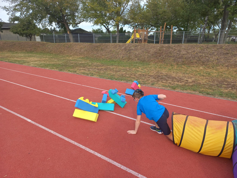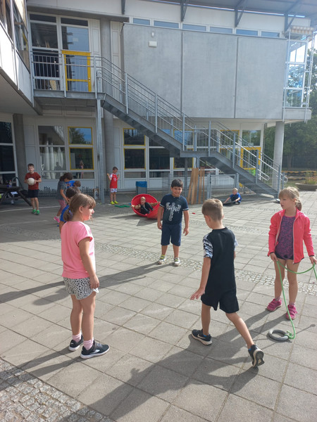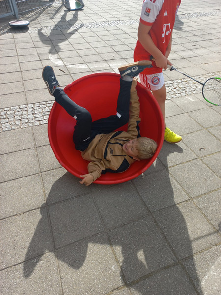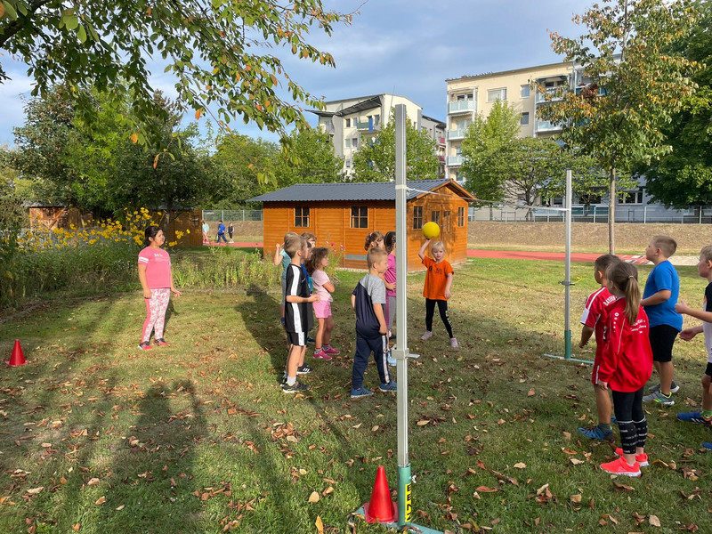 Nach der Erwärmung konnten die 1. und 2. Klassen im Schulgelände an 10 Stationen ihre Geschicklichkeit, die Schnelligkeit bzw. die Spielfreude erproben.