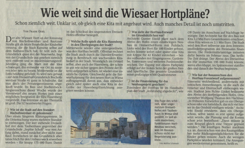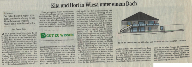 Endlich soll es werden! Im Jahr 2017 möchte die Stadt Kamenz den Neubau des Kinderhorts in Wiesa starten. Wir wünschen viel Erfolg und bedanken uns bei allen Beteiligten im Voraus.