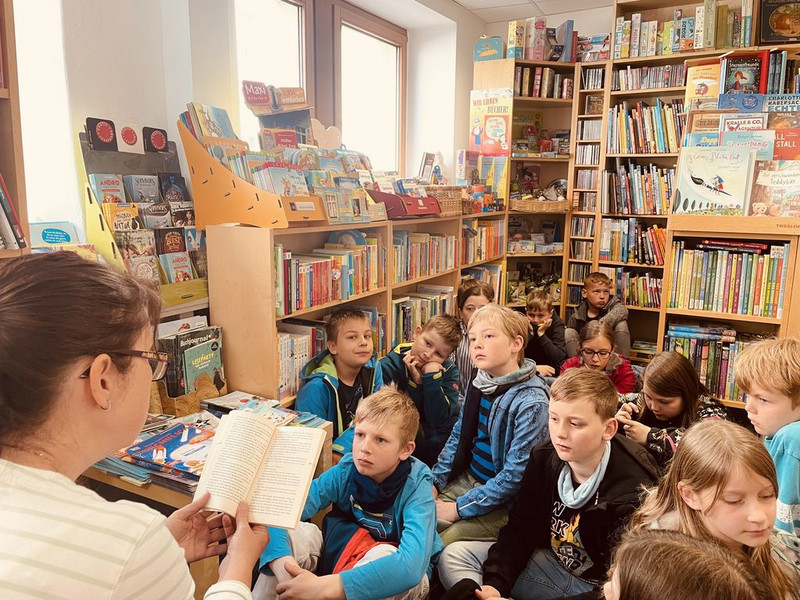 Die vierten Klassen der Grundschule Wilsdruff erwartete zum Welttag des Buches, der bereits am 23. April stattgefunden hatte, nicht nur eine willkommene Abwechslung zum Schulalltag in Form eines gemeinsamen Spaziergangs zum Buchgeschäft, sondern außerdem auch noch eine tolle Überraschung: Es gab Gutscheine, die jedes Kind gegen einen Comicroman eintauschen konnte, der eigens zu diesem Anlass geschrieben worden war. Der Welttag des Buches hatte dieses Jahr an einem Samstag stattgefunden, sodass der Besuch der Buchhandlung „Bücherstube Siegemund“ am Wilsdruffer Marktplatz am 2. Mai 2022 etwas verspätet stattfand. Aber das tat der Aktion keinen Abbruch: Frau Siegemund las den Kindern eine spannende Passage aus einem Buch vor und die Kinder lauschten gebannt. In der anschließenden Lesezeit in der Schule konnten die Kinder das neue Buch in Ruhe anlesen. Vor dem Aufbruch durften die Kinder aber natürlich noch etwas im Buchgeschäft stöbern und so ihren Appetit auf’s Lesen wecken!