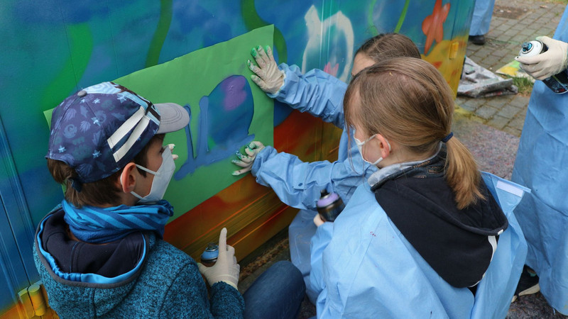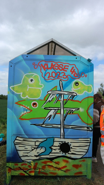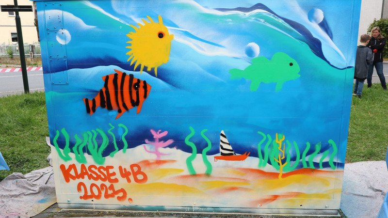 Zum Abschluss ihrer Grundschulzeit haben unsere vierten Klassen in Wilsdruff sichtbare Zeichen gesetzt. Mit freundlicher Unterstützung der Stadtverwaltung Wilsdruff fand vom 15. bis 17. Mai 2023 ein Workshop mit dem Graffitikünstler „Rudi“ statt. Nach einem Brainstorming zur Ideenfindung und einer ersten Einweisung zum Umgang mit Sprühdosen, wurden Schablonen im Vorfeld entworfen.