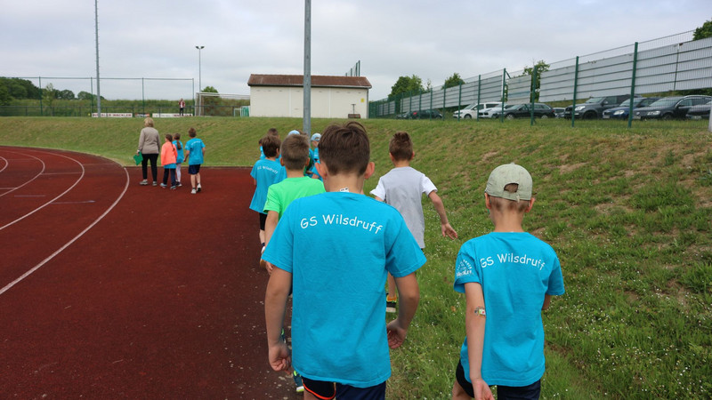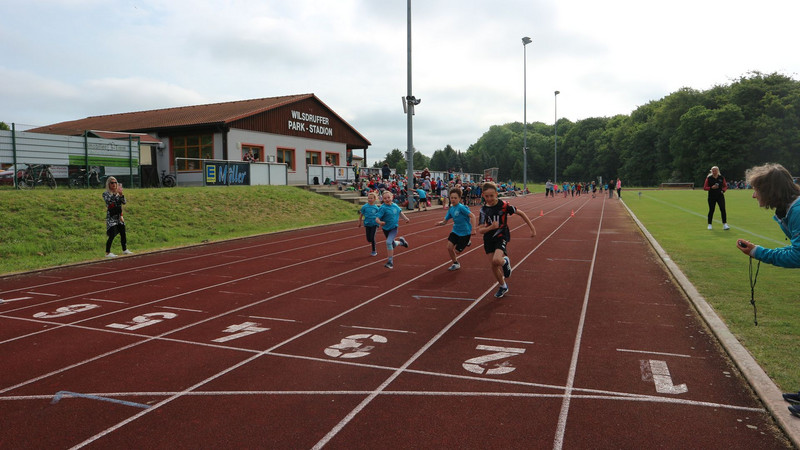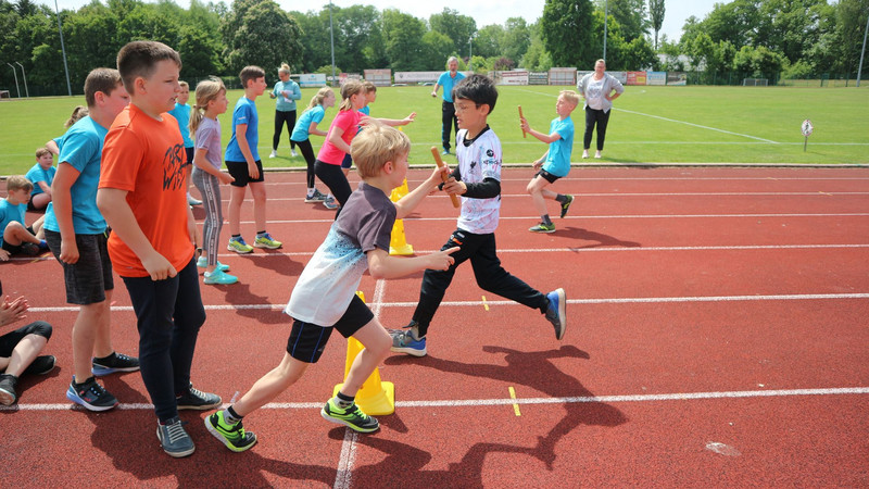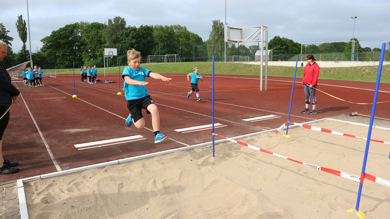 Unser traditionelles Sportfest fand am 2. Juni 2023 bei besten Temperaturen im Parkstadion statt. Nach der Begrüßung durch Herrn Lehmann und gemeinsame Aufwärmübungen konnten die Kinder ihre Kräfte beim Weitsprung, Weitwurf, dem 50m- Lauf und dem Crosslauf messen. Höhepunkt war der Staffellauf, bei dem die jeweils vier laufschnellsten Mädchen und Jungen einer Klasse unter lauten Anfeuerungsrufen antraten. Verschiedene Freizeitsportstationen füllten die Pausenzeiten zwischen den Disziplinen. Auch der Fußball rollte aktiv auf dem Feld.