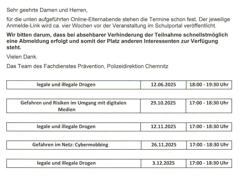 Zum einen bietet die Polizeidirektion Chemnitz Präventionskurse zu digitalen Medien bzw. Drogen (s. Übersicht). Sollten Sie Interesse an einem der Kurse haben, können Sie den Link zum jeweiligen Seminar bei uns erfragen.