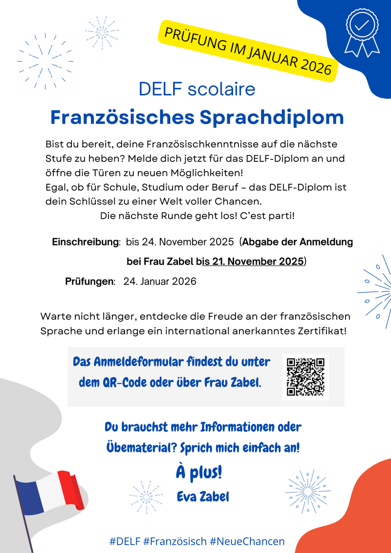 Die DELF scolaire-Prüfungen finden zwei Mal jährlich statt. Das Anmeldeformular und weitere Informationen erhaltet ihr bei Frau Zabel.