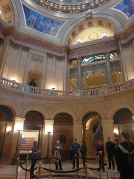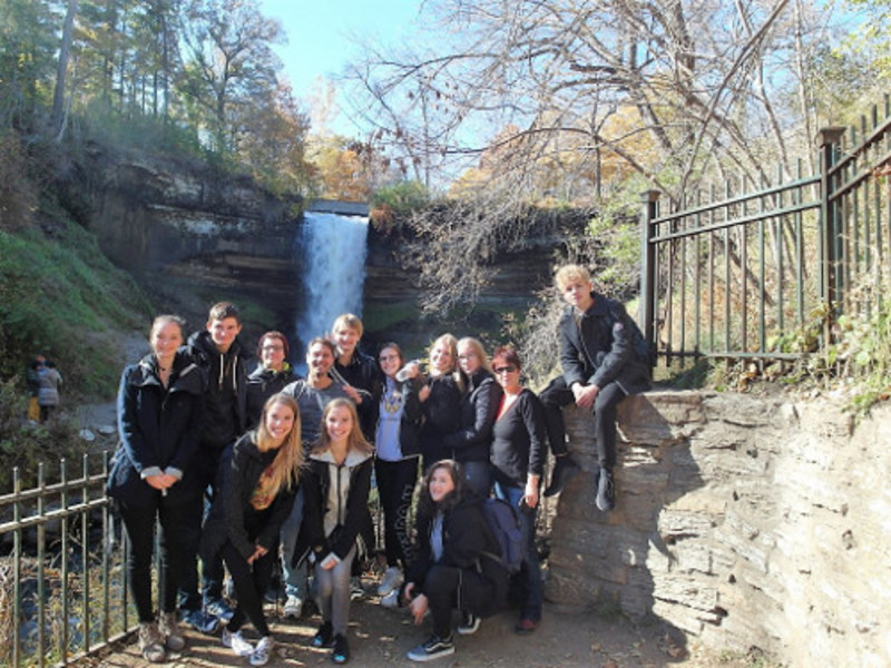 Letzter Tag in Minnesota, letzte Chance für einen Ausflug in die Twin Cities. Dieses Motto hat unter uns nicht gerade für Freude und Euphorie gesorgt. Morgens trafen wir uns in aller Frische wieder im South Campus der White Bear Lake Area High School, wie gewohnt um 8 Uhr. Ausgewählte Eltern und unsere Lehrer entschieden sich dann spontan dazu, einen Abstecher zum Kapitol des Bundesstaates Minnesota in der Hauptstadt Saint Paul zu machen. Das Kapitol in Saint Paul markiert das politische Zentrum von Minnesota. In ihm sind die drei Gewalten vereint. Die exekutive Gewalt bildet der Gouverneur, er hat sein Büro im Kapitol. Außerdem ist die Legislative mit dem Senat und dem Repräsentantenhaus vertreten, die Judikative wird durch den Supreme Court vertreten, der seinen Gerichtssaal ebenfalls im Kapitol hat. Diese interessanten Informationen wurden uns durch eine Führung vermittelt. Auch gelang uns der -für unsportliche Deutsche- beschwerliche Aufstieg auf das Dach zur vergoldeten Quadriga. Völlig außer Puste wurden wir für unsere großartige Leistung mit einem atemberaubenden Blick über Saint Paul bis nach Minneapolis belohnt. Natürlich wurde diese Gelegenheit für einige gute Fotos genutzt. Nach dieser Tour durchs Kapitol fuhren uns die Gasteltern in eine Parkanlage bei Minneapolis. Wir konnten dort einen großen Wasserfall bestaunen. Seine Gischt breitete sich in Wolken über uns aus. In diesem Naturpark genossen wir das schöne Wetter und die Natur sehr. 2.30 Uhr waren wir wieder an der Schule angelangt, einige Leute gingen danach noch ins Y, ein Fitnessstudio direkt am South Campus. Ich fuhr mit meiner Gastmama zum Geschenke kaufen in die Maplewood Mall, ein Einkaufszentrum nahe White Bear Lake. Um 7 Uhr trafen wir uns dann zu einem Abschiedstreffen mit Frau Booth, der Deutschlehrerin der Schule. Gemeinsam schlangen wir unsere sehr üppige und leckere Eiscreme in uns hinein. Ich sündigte mit 2 sehr großen Komplett-Eisbechern. Wen interessiert schon das Gewicht bei so einem wunderbaren Abend. Die Gastfamilien begleiteten uns an unserem Abend. Danach ging es nachhause, dort musste ich mich dann gezwungenermaßen mit der lieben Kofferpackerei beschäftigen. Den Rest des Abends verbrachte ich dann im Kreise meiner Familie. Wir tauschten unsere Geschenke aus und sprachen über Möglichkeiten, den Kontakt zwischen uns weiter halten zu können. Es war ein wunderbarer letzter Abend, ich vermisse meine Gastfamilie sehr. Sie sind mir ans Herz gewachsen.