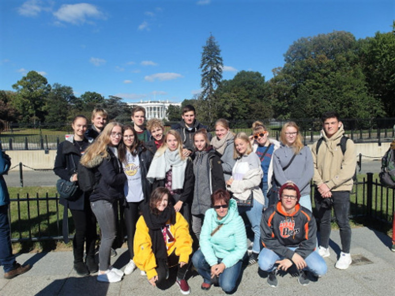 Kurz vor 14:00 Uhr machten wir uns auf den Weg zum Weißen Haus. Dort angekommen entstanden viele Fotos von uns mit dem Weißen Haus im Hintergrund. Ein Fernsehteam wurde auf uns aufmerksam, da wir uns auf deutsch unterhielten und fragten Herrn Jackel, ob er sich bei einem Interview zum Thema des Atomabkommens zwischen den USA und Russland äußern möchte. Er willigte ein und unsere Gruppe verfolgte dieses Interview sehr gespannt.