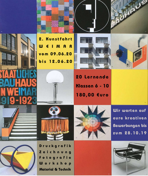 Wieder gibt es max. 20 Plätze für kunstinteressierte Schülerinnen und Schüler. Bewerben könnt ihr euch bis zum 28.10.19. Eure Bewerbung sollte individuell und kreativ sein. Zeigt uns, was euch im künstlerischen Bereich interessiert, euch inspiriert, euch Freude macht - egal, ob ihr gern fotografiert, zeichnet, malt, collagiert, entwerft und näht, baut oder filmt. Legt eurem künstlerischen Werk ein kleines Motivationsschreiben bei, worin ihr euch kurz vorstellt und deutlich macht, weshalb ihr so gern zur Kunstfahrt nach Weimar fahren wollt.