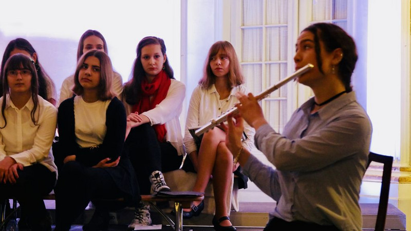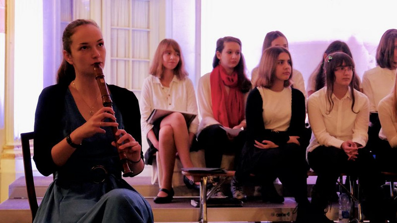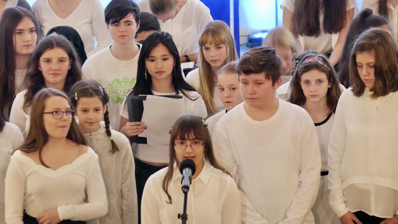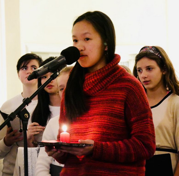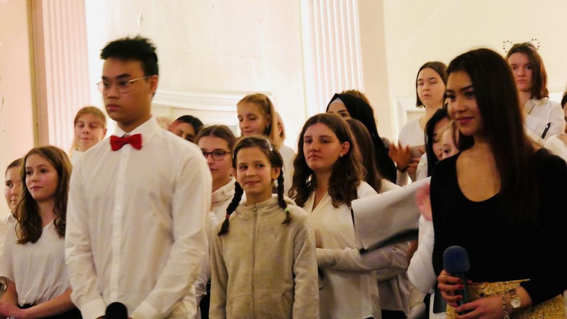 Auch die diversen literarischen Beiträge von Schülerinnen und Schülern verschiedener Jahrgangsstufen, die vom Stern der Sehnsucht, vom Winterabend, von dem Versuch weniger zu schenken und von der Weihnacht erzählten, trugen zu einer besinnlichen Atmosphäre bei. Die Weihnachtszeit in Deutschland wird stets von dem meist unerfüllten Wunsch nach Schnee begleitet, diese Sehnsucht spiegelte sich in dem russisch/deutschen Gedicht „Es schneit“, welches von Dana Marants und Emma Gabke vorgetragen wurde, wider. Dass Winter und Kälte letztendlich eine Frage der Einstellung sind, verdeutlichten Schülerinnen und ein Schüler der Jahrgangsstufe 12 durch ihren anschaulichen und amüsanten literarischen Beitrag.