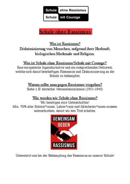 Wie ihr sicherlich schon gesehen habt, haben wir in der Schule einige Plakate angebracht, um auf unser Projekt Schule ohne Rassismus – Schule mit Courage aufmerksam zu machen.