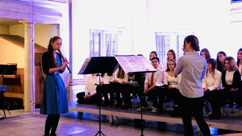 Der Abend begann mit dem ersten Auftritt der beiden Chöre des Brockhaus-Gymnasiums, die nicht nur voller Freude das Lied „In dulci jubilo“ sangen, sondern auch das Publikum durch ihre musikalische Darbietung verzauberten. Die gelungene Moderation der Schülerinnen Nelly Zeißig, Leonie Hantzschel und Nadine Noak des LK Deutsch des 12. Jahrganges begleitete das Publikum durch das Weihnachtskonzert. Außerdem traten verschiedene Schülerinnen und Schüler auf, die ihr instrumentales Können unter Beweis stellten. So spielte der Sechstklässler Hjalmar Hase „Somewhere in my memory“ auf dem Klavier und rief sicherlich bei vielen Zuschauern Erinnerungen an den Film „Kevin allein zu Haus“ hervor. Klara Fieseler und Yasmin Barthel lieferten sich ein denkwürdiges Duell auf der Flöte und der Querflöte und das Bläserensemble um Felix Westerhoff sorgte mit den Liedern „Latinette“, „Rondo Humoreske“ und „Macht hoch die Tür“ für Weihnachtsstimmung.