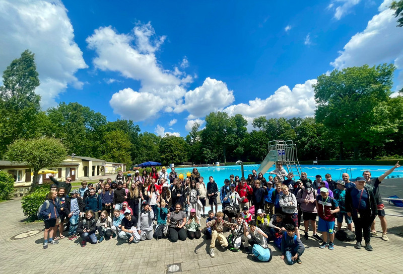 Ein besonderes Highlight wartete am Ende des Schuljahres 2023/24 auf unsere 6. Klassen, welche zum ersten Mal drei Schwimm-Kompakt-Tage durchliefen. Die tägliche Fahrt zum Sommerbad Kleinzschocher erwies sich als lohnend. Auch wenn die Wetterlage mit 18-20 Grad nicht unbedingt optimal war, konnten die Sportlehrerinnen und Sportlehrer, die den Schwimmunterricht vor Ort an den drei Tagen koordinierten, ein schönes Programm im und außerhalb des Wassers zusammenstellen. Neben spielerischer Wassergewöhnung stand auch Technikschulung auf dem Plan. Ein großes Dankeschön geht hierbei an unseren Förderverein, der einen ganzen Klassensatz Schwimmbretter finanziert hat, welche direkte Verwendung fanden. Insgesamt mussten die Wasserzeiten aufgrund der kühlen Temperaturen etwas gekürzt werden. Dank der optimalen Bedingungen vor Ort (u.a. Beachvolleyball-Feld, Tischtennis-Platten, Spielplatz) standen genügend Bewegungsangebote zur Verfügung. Höhepunkt war dabei ein Klassenwettbewerb mit verschiedenen Disziplinen, bei dem sich die Klasse 6c den Pokal sichern konnte. Vielen Dank an alle Beteiligten. Wir freuen uns auf’s nächste Jahr!