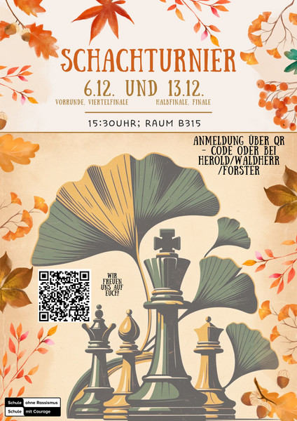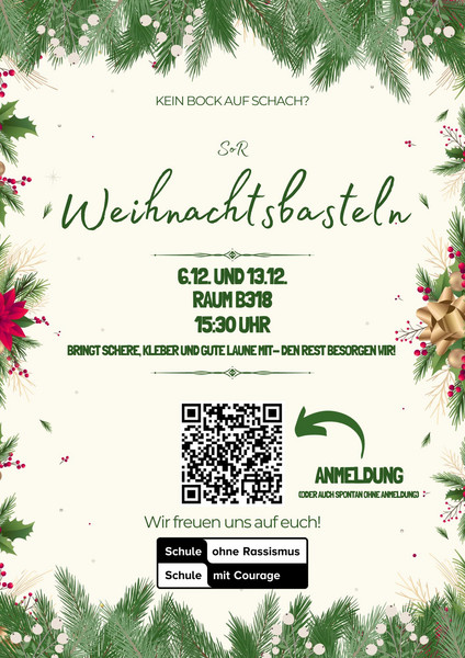Kommt vorbei also am Mittwoch, den 13.12. um 15:30 Uh vorbei, in der B313 zum Schachturnier und in der B318 zum Basteln, feuert eure Favoriten an und lasst euch von der weihnachtlichen Bastellust anstecken. Wir freuen uns auf einen weiteren Tag voller Überraschungen und kreativer Energie!