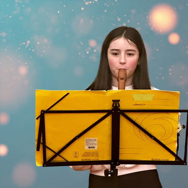 Luisa aus der Klasse 6a zeigte erneut ihr Können auf der Blockflöte. Mit einem modernen Stück, begleitet von Herrn Jaenicke am Klavier, zeigten die beiden, was alles aus dem vermeintlich für jeden spielbaren Instrument herauszuholen ist und musizierten eine „Liebeserklärung an die Blockflöte“ auf höchstem Niveau.