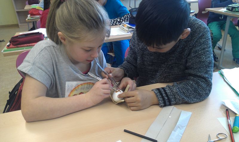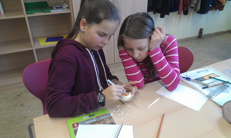 Passend zur Osterzeit wurden im Biologieunterricht der 5. Klassen mit großem Interesse Hühnereier präpariert. Die Schülerinnen und Schüler haben hierbei das doch so oft schon gesehene Ei etwas genauer unter die Lupe genommen und konnten dabei ungeahnte Beobachtungen machen. Die Hagelschnüre waren dabei besonders interessant und dass die Kalkschale mit vielen kleinen Poren durchsetzt ist, fällt im Alltag auch kaum auf. Das wissenschaftliche Arbeiten mit der Präparation des Hühnereis und der Anfertigung einer biologischen Skizze konnte dadurch eingeführt werden.