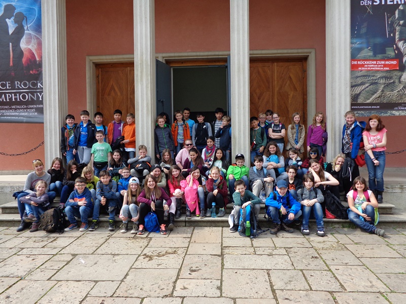 Der Dienstag startete recht früh mit einem stärkenden Frühstück. Für den Tagesausflug ging es mit der Bahn nach Jena ins „Paradies“. Dort angekommen erwartete uns das Carl-Zeiss-Planetarium mit anschließendem Besuch des optischen Museums. Hier hatten die Kinder Gelegenheit ihre Vorkenntnisse aus dem Bili-Vorbereitungskurs zum Thema Our Solar System zu vertiefen. Die 1,5 stündige Vorstellung war definitiv ein Highlight der Klassenfahrt. Neben dem informativen Programm gab es natürlich auch Möglichkeiten zur individuellen Freizeitgestaltung bevor es nach einer „Eiszeit“ zurück nach Bad Sulza ging. Den steilen Berg zur Jugendherberge erklommen warteten originale Thüringer Bratwürste mit leckeren selbstgemachten Salaten auf uns. Genau das Richtige nach einem so erlebnisreichen Tag. An dieser Stelle nochmals ein großes Dankeschön an die Küchenfachkräfte und unseren Grillmeister, die als Dankeschön für die gute Bewirtung vor Abreise einen Blumenstrauß von uns erhielten. Zum Abend hin wurden auf dem Gelände gemeinsam Fangspiele, Volleyball, Basketball und Fußball gespielt. Erschöpft aber sehr zufrieden ging es am Dienstag zu Bette.
