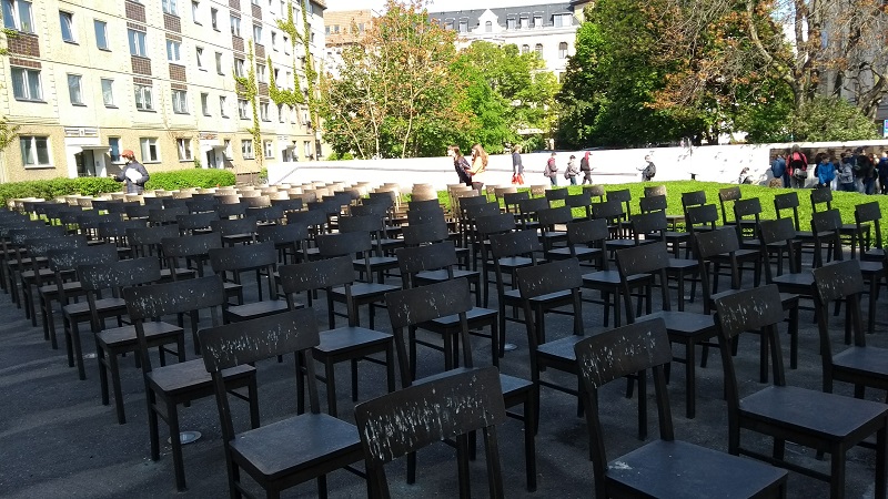 Das erste Ziel war die Gottschedstraße, wo wir eine Gedenkstätte an die am 9./10.11.1938 von Nazis zerstörte Synagoge vorfanden. Diese bestand aus insgesamt 140 Bronzestühlen auf dem Grundriss der ehemaligen Synagoge.