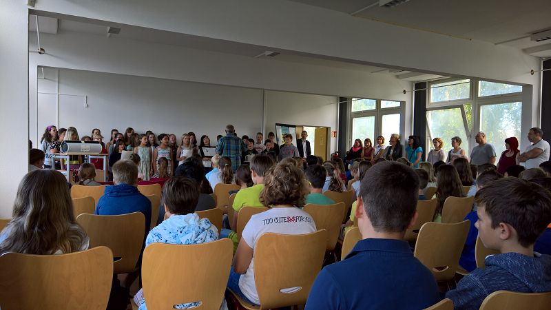 Danach präsentierte unser Chor unter der Leitung von Herrn Eichler ein kurzes unterhaltsames Programm, wobei die neuen Schüler und Schülerinnen gleich zum Mitmachen animiert wurden.