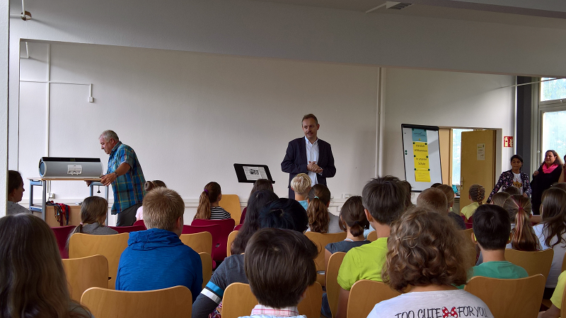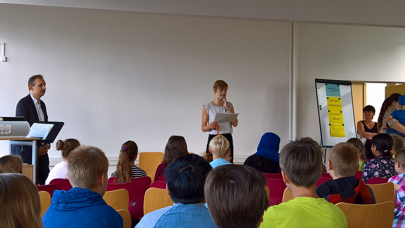 Pünktlich 8.00 Uhr war es dann so weit – die neuen 5.-Klässler wurden bei uns in der Aula herzlich in Empfang genommen und durch den Schulleiter, Herrn Coccejus, begrüßt.
