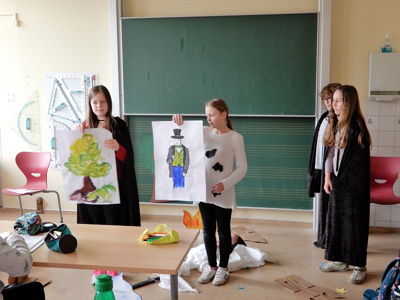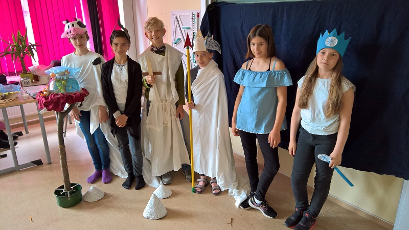 Wie in den Impressionen zu sehen ist, haben sich die Schüler der Klasse 5-3 sehr viel Mühe gegeben, haben ganz wundervolle Requisiten gebastelt und haben die Schöpfungsmythen sehr gut nachgespielt.