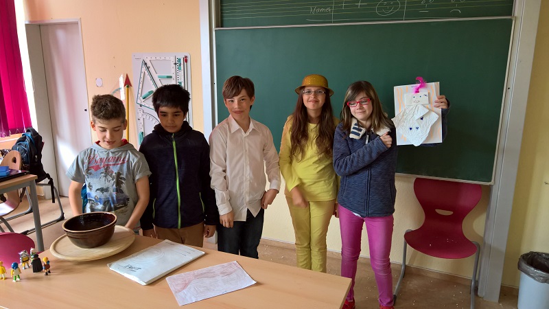 Inzwischen haben auch die Schüler der 5-1 ihre Gruppenarbeitsergebnisse präsentiert und auch hier wurden extra für die Präsentationen Kostüme genäht, natürlich von den Eltern, damit der Schöpfergott Re-Atum auch wirklich ägyptisch aussieht.