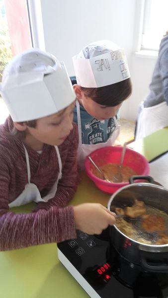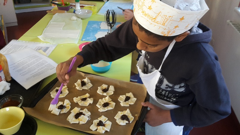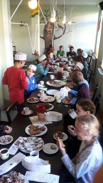 Die Zeit der Weihnachtsfeiern ist eingeläutet und den Beginn machte die Klasse 5/1 im Kinderrestaurant auf der Eisenbahnstraße. Unter professioneller Anleitung wurden weihnachtliche Köstlichkeiten aus aller Welt zubereitet. In Kleingruppen backten die Kinder unter anderem finnische Weihnachtsrädchen, schwedische Lebkuchen und russische Mützen. Der Gaumenschmaus-Sieger des Tages waren die Buñuelos – ein Schmalzgebäck aus Spanien, das mit Äpfeln gefüllt wird. Nachdem alle Arbeitsplätze wieder sauber und die Backutensilien abgewaschen waren, wurde abschließend bei Fruchtpunsch und Weihnachtsliedern ausgiebig geschlemmt. Was bis zur Abreise nicht in den Bäuchen gelandet ist, konnten die Schülerinnen und Schüler in Tüten mit nach Hause nehmen. Die Eltern werden bestimmt stolz auf die Weihnachtsköstlichkeiten ihrer Kinder sein.