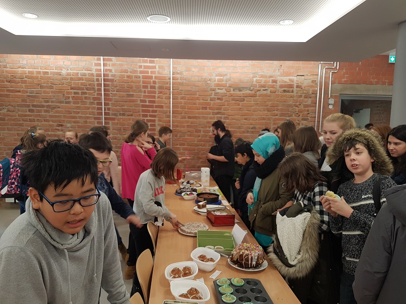 Am 15.12.2017 führte die Klasse 6-2 einen Kuchenbasar an unserer Schule durch. Ziel war es, das fehlende Geld für unser Klassenklimaprojekt zusammen zu bringen. Dank der gigantischen Unterstützung von Eltern, Schülern und Lehrern ist es gelungen die fehlende Summe aufzubringen.