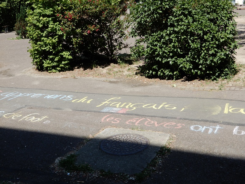 Mit Kreide ausgestattet wurden auf dem Schulhof Sätze und kleine Geschichten verfasst – in unseren drei 2. Fremdsprachen Russisch, Spanisch und Französisch. „Was bedeutet „Nous aimons d’apprendre la langue française.“? oder „Wie übersetzt man „ En nuestro colegio nos gustan…“? – die Schüler unterrichteten sich gegenseitig und lernten so voneinander und miteinander.