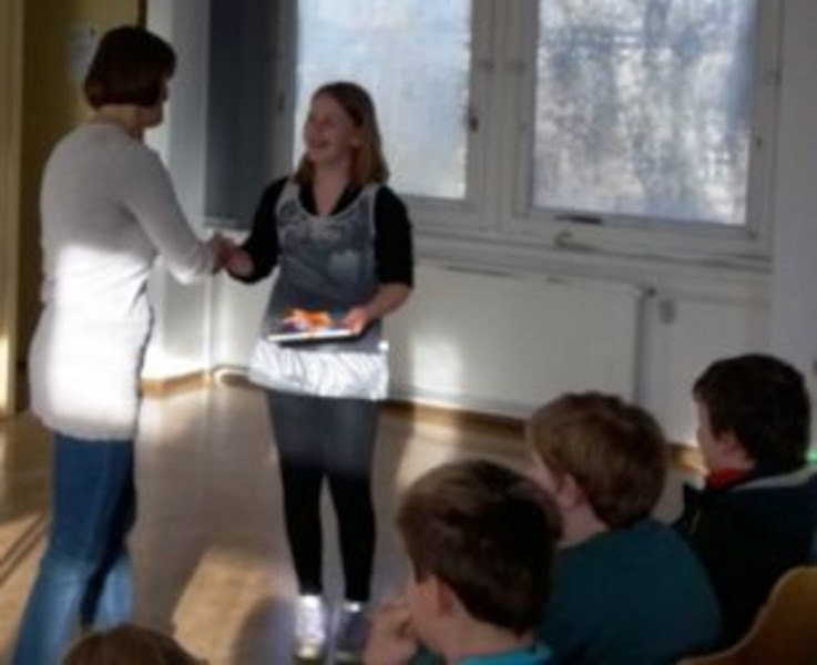 Ein paar Tage später wurden dann die Sieger unter dem Beifall aller Schüler der Klas-senstufe 5 in der Aula geehrt. Herzliche Glückwünsche an Emely und Philine aus der 5-3 und Finn aus der 5-2.