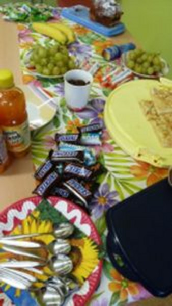 Mit Ausdauer machten sich die Teilnehmer und lösten die vier teils sehr kniffligen Aufgaben. Als kleine Belohnung konnte sich jeder an einer bunten Tafel mit Obst, Kuchen, Süßigkeiten und Getränken reichlich bedienen.