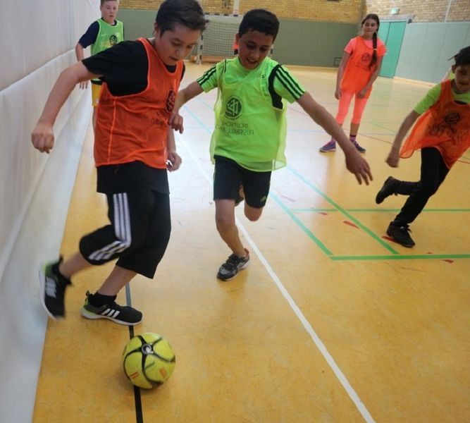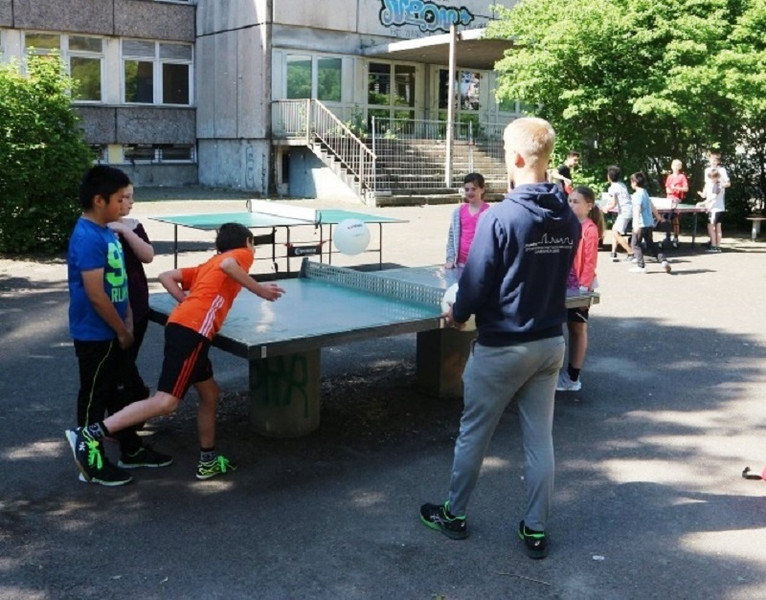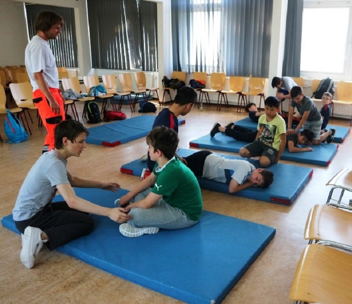 Die Schüler der Klassen 5 und 6 nutzten Turnhalle, Sportplatz, Hof und Schulhaus, um sich in großer Vielfalt sportlich zu betätigen. Aus der Vielzahl unterschiedlicher Sportarten haben unsere Sportlehrer einige herausgesucht. Mit Unterstützung von Trainer und Betreuern umliegender Vereine durften unsere Schüler an verschiedenen Stationen neben Fußball oder Volleyball auch Tischtennis, Rugby und Tanz trainieren. Dazu gab es eine Fitness-Station, welche die Ausdauer der Schüler sehr forderte. Da es beim Sport auch zu Verletzungen kommen kann, bot die Station Erste Hilfe die Möglichkeit, mit zwei Notärzten das richtige Verhalten kennen zu lernen. Am Ende gab es zum Glück keine großen Verletzungen, dafür aber strahlende Sieger, die sich über den Applaus und ein kleines Geschenk freuen konnten.