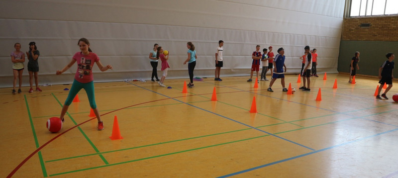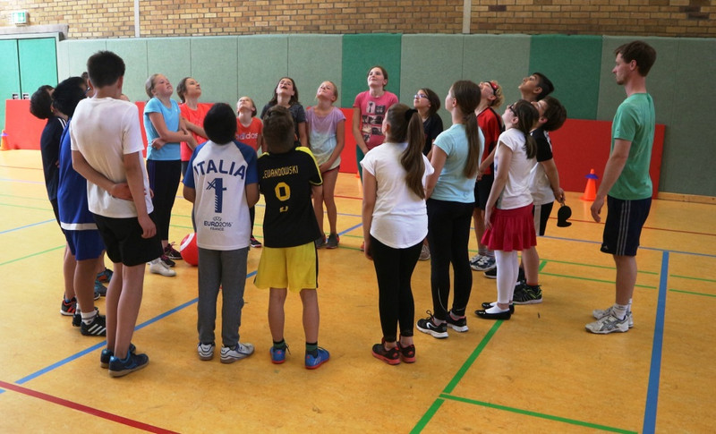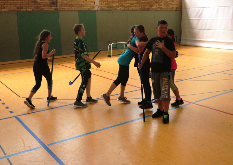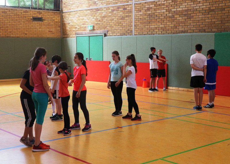Nun war es an der Zeit, sich den Olympischen Spielen der Neuzeit zuzuwenden. Genau wie bei den Olympischen Spielen der Spitzensportler, starteten auch unsere Schülerinnen und Schüler mit dem Olympischen Eid in den Wettkampf. Sie versprachen: „an den Olympischen Spielen teilzunehmen und dabei die gültigen Regeln zu respektieren und befolgen und sich einem Sport ohne Doping und ohne Drogen zu verpflichten. Im wahren Geist des Sporttreibens, für den Ruhm des Sports und die Ehre ihrer Mannschaft.“ Einer gemeinsamen Erwärmung konnte nun direkt der sportliche Wettkampf folgen. Jede Klasse hat zuvor zwei Mannschaften eingeteilt, welche sich im Fußball und Unihockey gegenüberstanden. Neben den Turnieren der Olympischen Spiele erhielten die Kinder einen Einblick in die Paralympischen Spiele. Beim Blindenfußball erfuhren die Sportlerinnen und Sportler am eigenen Leib, was es bedeutet, Sport mit einer Einschränkung zu betreiben. Ausgestattet mit Augenmasken, mussten sich die Kinder voll und ganz auf ihr Gehör verlassen, um den Ball zu orten, der beim Blindenfußball mit einer kleinen Klingel im Inneren ausgestattet ist. Bei den nächsten paralympischen Spielen 2018 werden die Leistungen der beeinträchtigten Athleten nun mit ganz anderen Augen betrachtet werden.