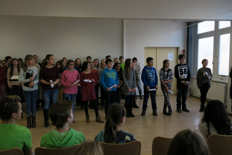 Traditioneller Weise präsentierte unser Chor am Mittwoch, dem 21. Dezember, ein kleines stimmungsvolles Weihnachtskonzert, um alle Schüler und Lehrer der Schule auf das bevorstehende Fest einzustimmen.