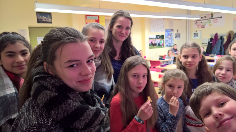 After 20 minutes, we went to the third station. The third station was the Russian pancake station. There we made pancakes Mrs Lindner, but first we learnt the ingredients we need to make pancakes in Russia. We could eat pancakes with jam or sugar. The jam was from Russia but the sugar from Germany. But anyway, the pancakes were great and yummy!