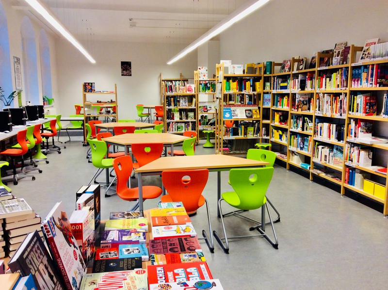 ... in der Schulbibliothek der Louise-Otto-Peters-Schule - kurz: LOPS-Bibo. Im Herbst 2015 wurde die Schulbibliothek nach Umbaumaßnahmen in der ehemaligen Aula eröffnet. Hell, groß und modern eingerichtet mit Regalen voller aktueller Medien ist seitdem der Raum 11 gleich im Erdgeschoß der Ort der Bücher, Zeitschriften, DVDs und jeder Menge Gesellschaftspielen am LOPS. Unsere Schülerinnen und Schüler können ihn als Lern-, Rechercheort und social room besuchen. Hier gibt es über 2.000 aktuelle Medien, sechs Computerarbeitsplätze, jede Menge Offline-Spiele, ein Tauschregal, Tischtennisschläger für die Pause und und und ...