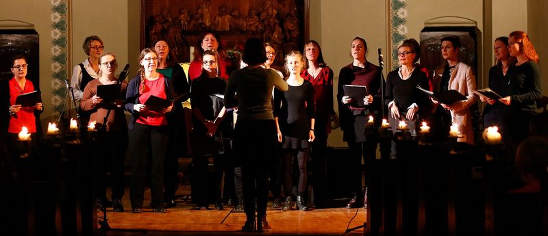 In der zweiten Hälfte des Abends, traten nacheinander der kleine Chor (fünfte und sechste Klassen), der große Chor (siebte bis zwölfte Klassen) und zum Schluss die legendären ELCHE (der Eltern-Lehrer-Chor) auf. Der kleine Chor sang sogar ein modernes Poplied und tat sich für einen alten englischen Weihnachtsklassiker mit dem großen Chor zusammen. Der große Chor faszinierte die Zuschauer mit einem vom Chorleiter Herrn Mummert selbst komponierten Musikstück in Begleitung eines Cellos. Den Abschluss des Konzertes bildeten die Lehrer*nnen und Eltern mit gewohnter Begeisterung und hoher Qualität.