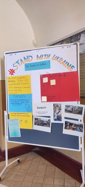 Im Geographie GK 1 der 11. Klassen ergab sich am Montag, dem 28.02., spontan die Idee Sachspenden für ukrainische Geflüchtete zu sammeln. Aus diesem Grund wurde in der Kürze der Zeit von den Schüler*innen eine kleine Infowand vor der Bibliothek aufgestellt.