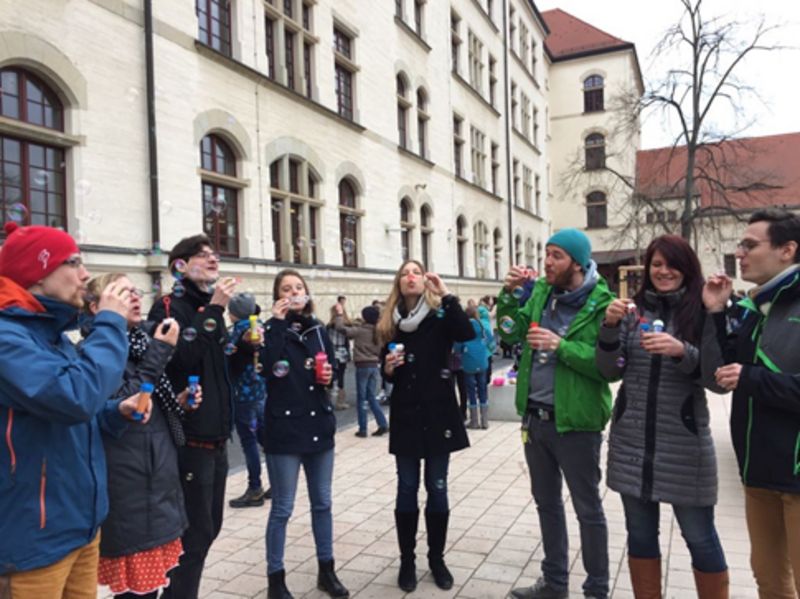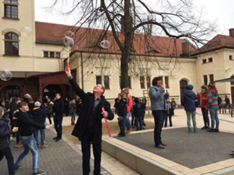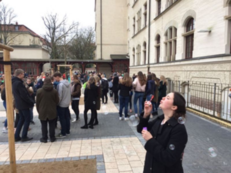 In der ersten Hofpause wurde zu einer Seifenblasen-Aktion aufgerufen. Viele Schüler*innen und Kolleg*innen trafen sich mit Seifenblasen im Gepäck auf dem Schulhof um ihre Glückwünsche für Louise mit diesen Seifenblasen in den Himmel zu schicken. Das wurde eine fröhliche Seifenblasen-Pust-Aktion, an der nicht nur die Kids, sondern auch die Lehrenden ihre Freude hatten.