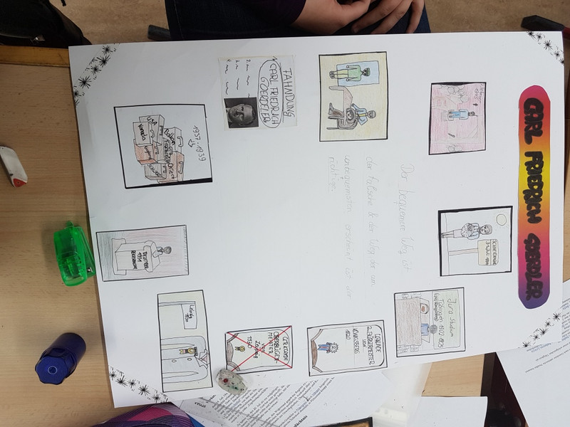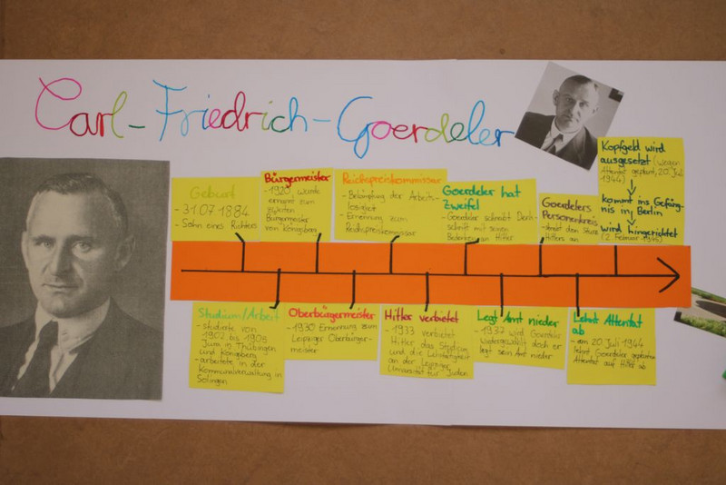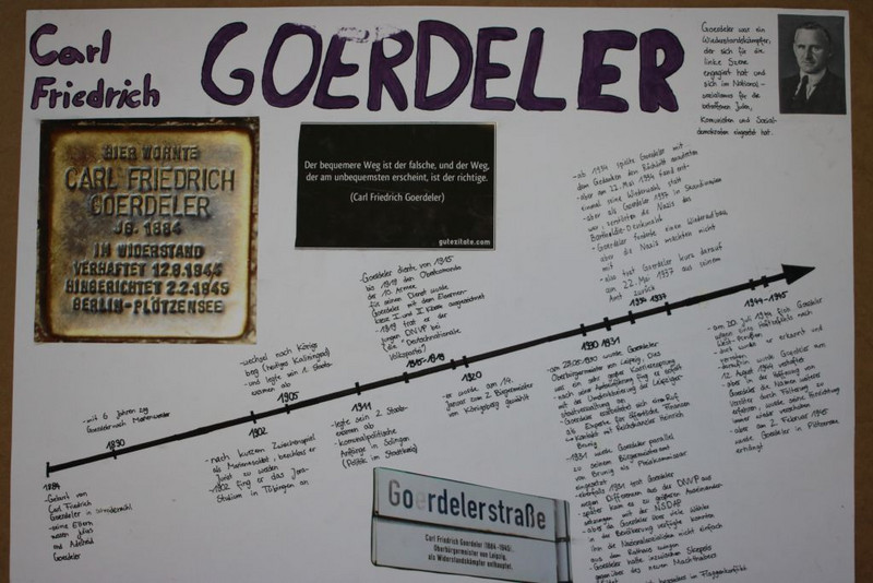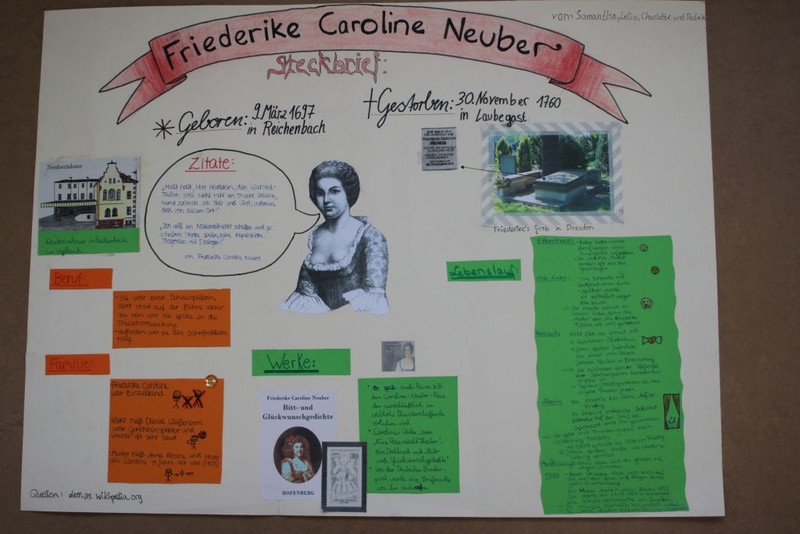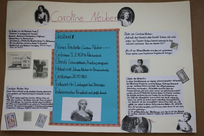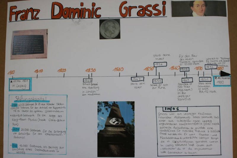Die Schüler haben sich zur Aufgabe gemacht, in kleineren Arbeitsgruppen eine Persönlichkeit ihrer Wahl genauer unter die Lupe zu nehmen. Insbesondere wurden hier deren biografische Eckpunkte, Bedeutung für Leipzig und besondere Leistungen herausgearbeitet. Die Schüler haben ihre Ergebnisse durch verschiedene Methoden dargestellt und präsentiert. Es entstanden viele kreative Plakate, Zeitstrahle, Steckbriefe, Kalenderblätter, Comics und Features. Anschließend wurden die Ergebnisse innerhalb der Klassen vorgestellt und sich darüber ausgetauscht, wie man die einzelnen Persönlichkeiten in das Schulleben integrieren und würdigen könnte.
