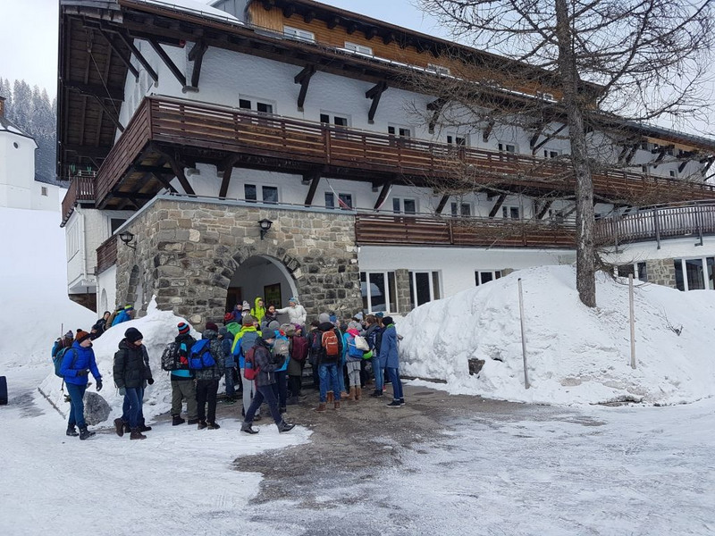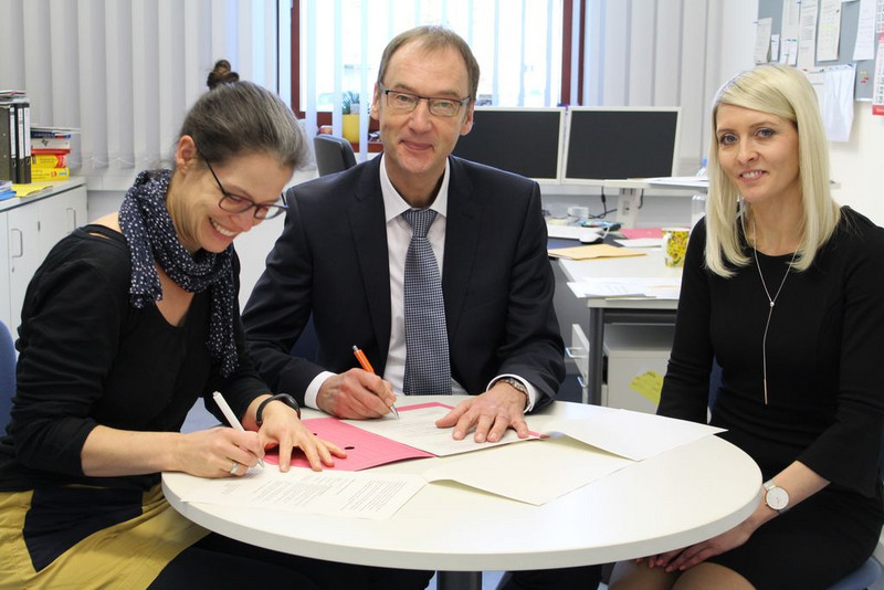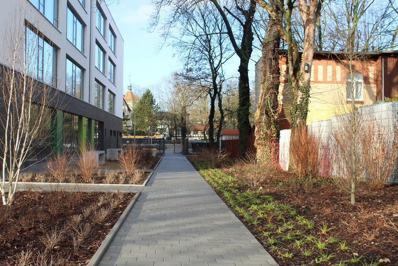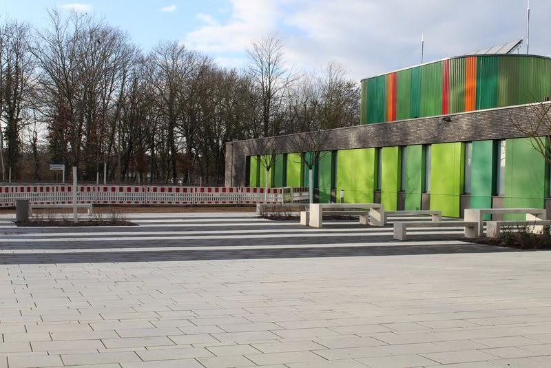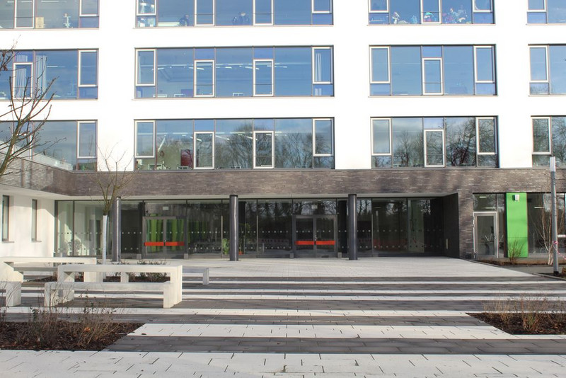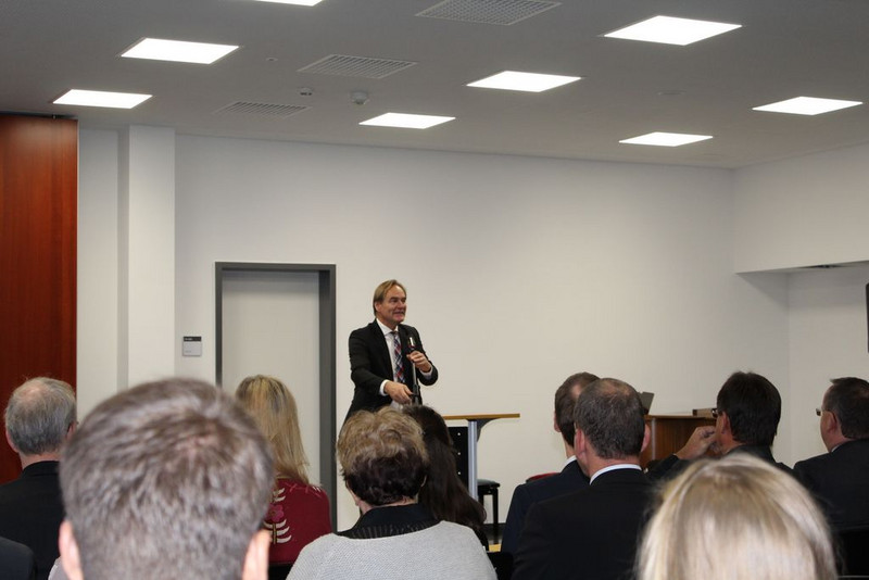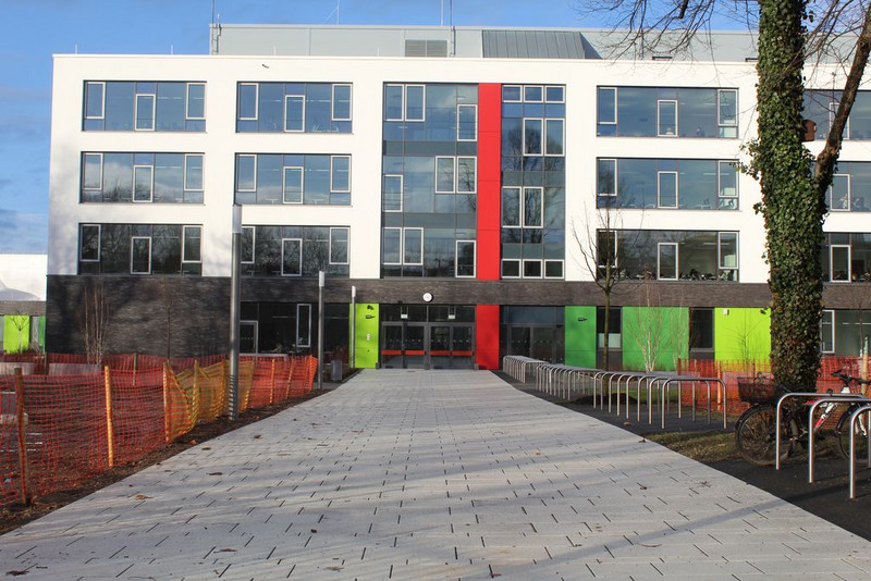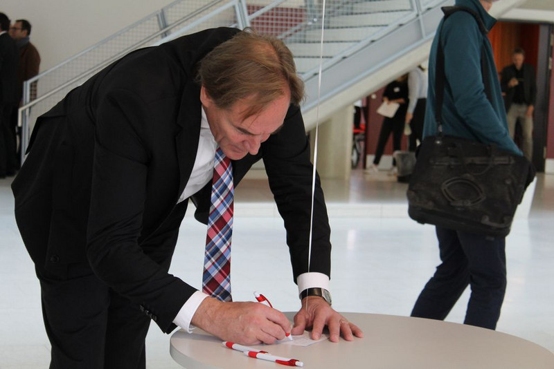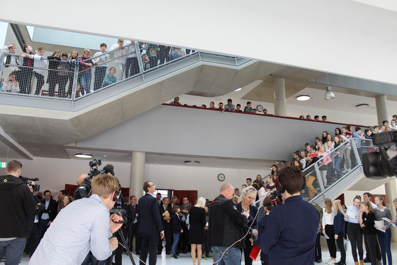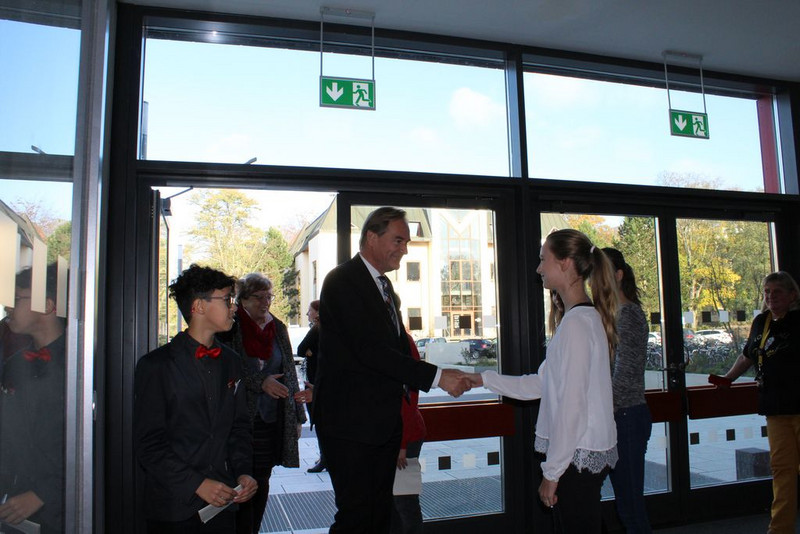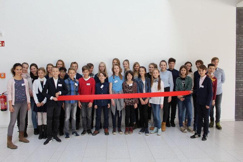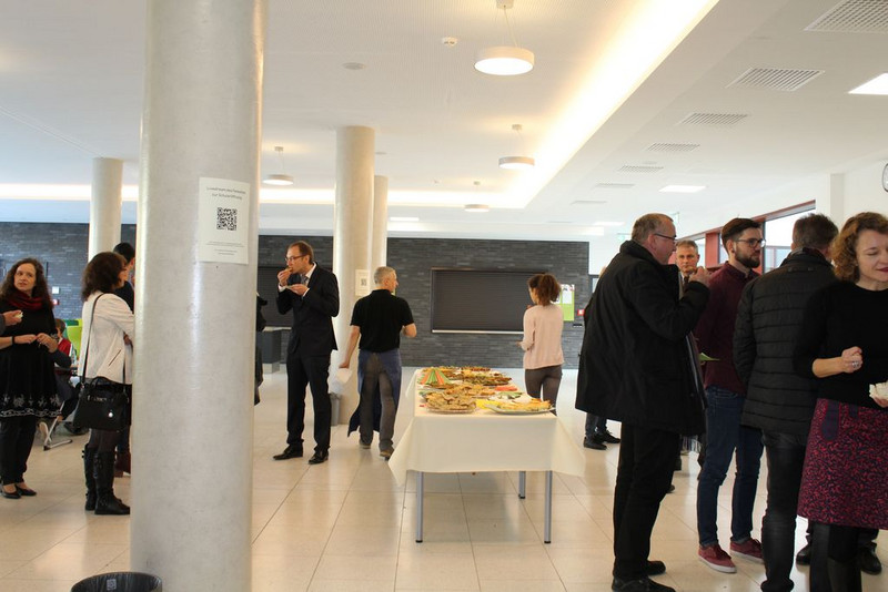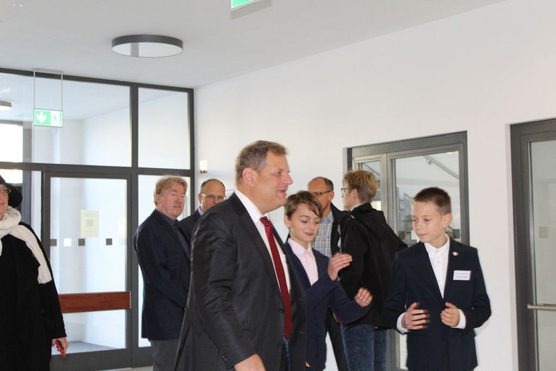 Prof. Dr. Fabian wies die Gäste abschließend noch auf die Zerschneidung des roten Bandes hin, womit die Schule als offiziell eröffnet gilt und die durch die Schülerlotsinnen und -lotsen durchgeführten Schulhausführungen sowie der Eröffnung des Buffets.