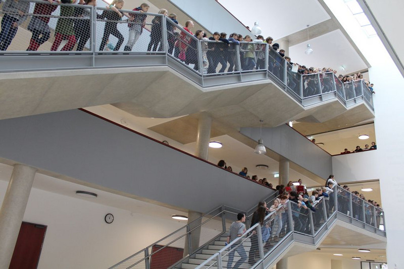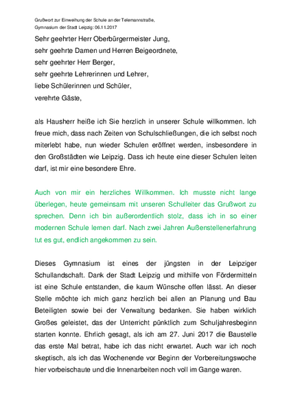 Die Rede von Herrn Schmidt handelte davon, dass er stolz ist, an dieser schönen Schule Schulleiter sein zu dürfen und wie stolz er auf diese Schule ist. Außerdem dankte er allen Handwerkern und weiteren Beteiligten, den freundlichen und offenen Lehrern, dem Förderverein der schon vor dem Bau der Schule vorhanden war. Er lobte auch die vielen verschiedenen Ganztagsangebote. Lotte sprach von der alten und ungemütlichen Interimsschule in der Erfurterstraße in Gohlis, wo sich trotzdessen Schüler und Lehrer gut verstanden und hofft, dass auch weiterhin unter den Schülern und Lehrern ein gutes Klima herrscht.