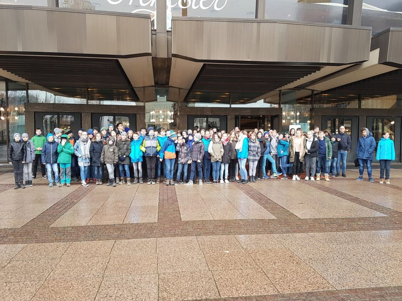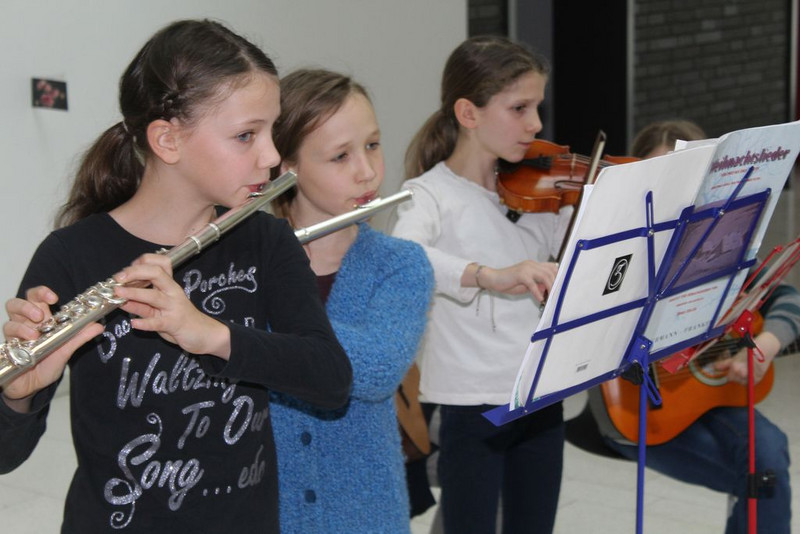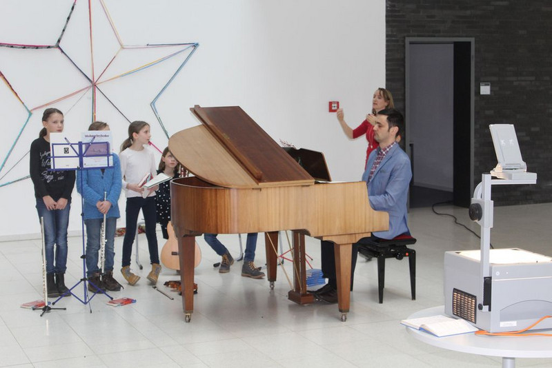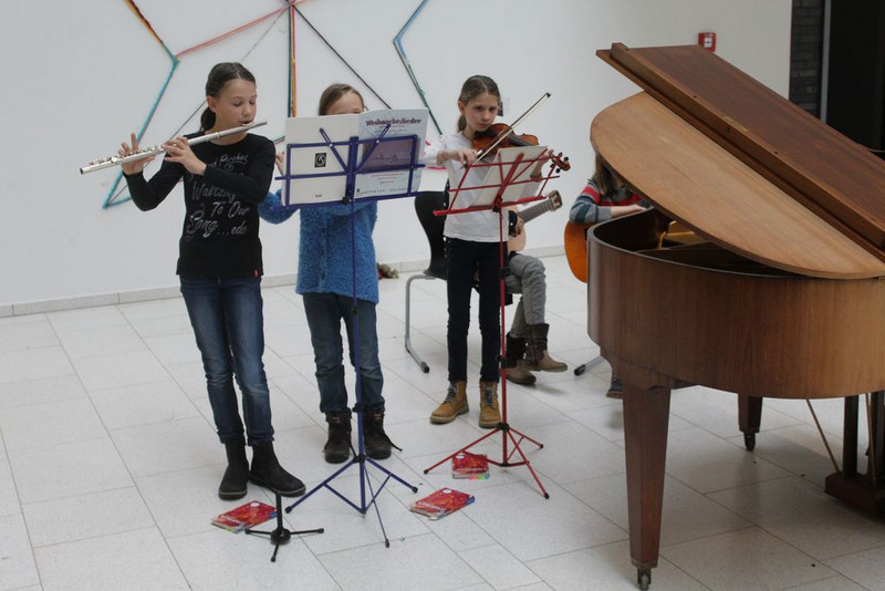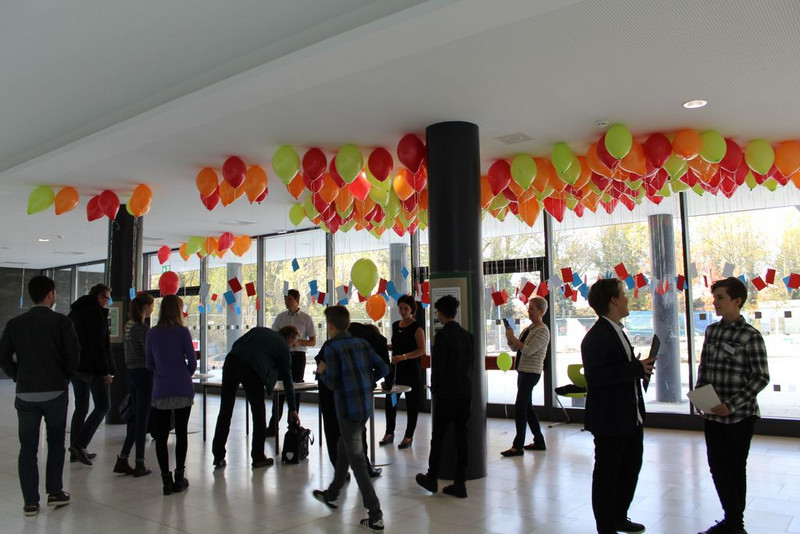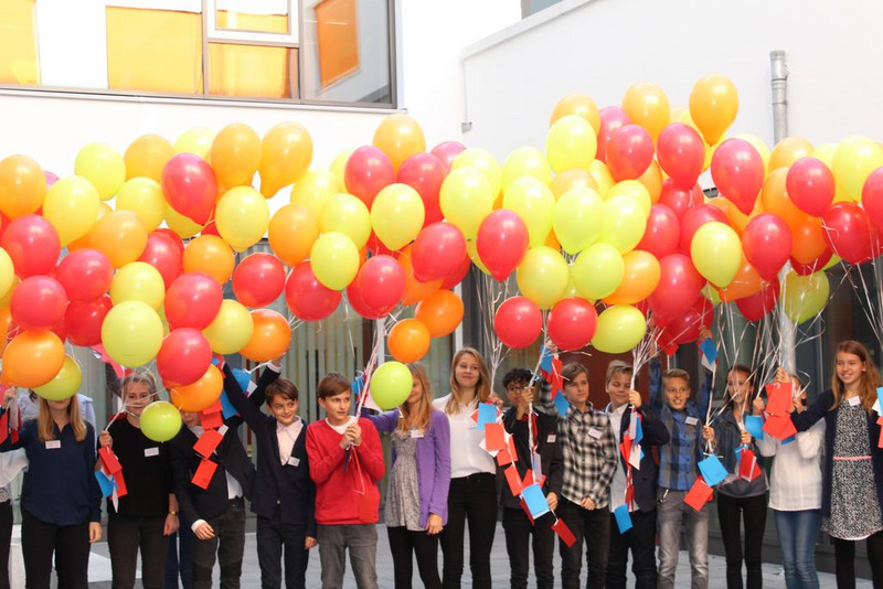 Dann gingen alle in den Innenhof und sahen zu wie die bunten Heliumluftballons mit den Wünschen in den blauen Himmel stiegen. Anschließend lauschten die Gäste einem Zweistimmigen Klavierstück von zwei Schülern des Max-Klinger Gymnasiums der 10. Klasse.
