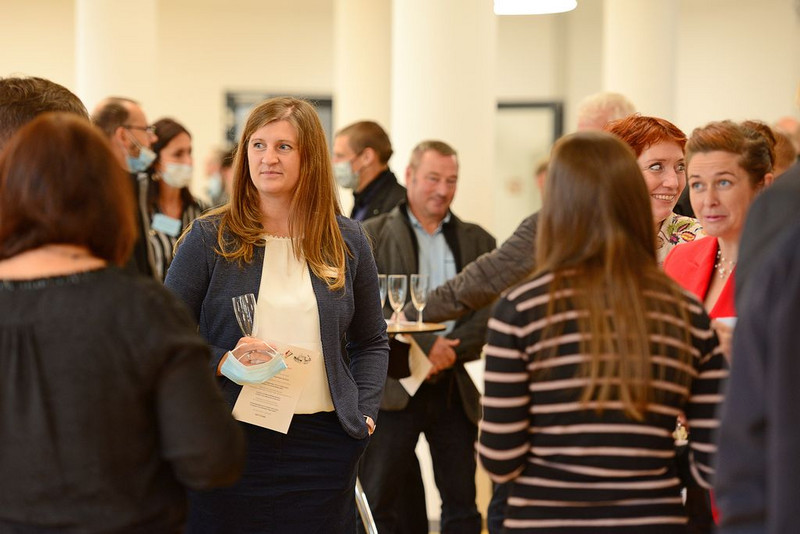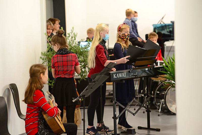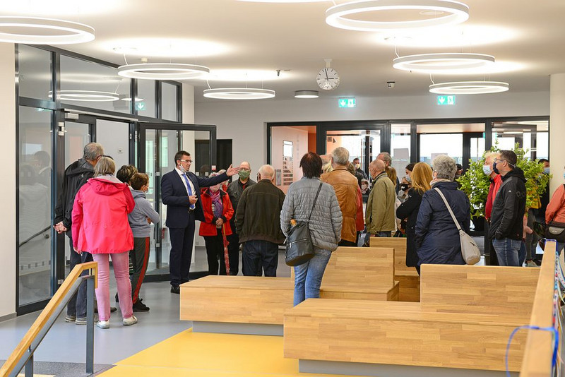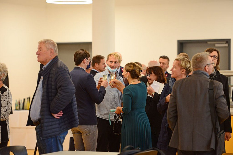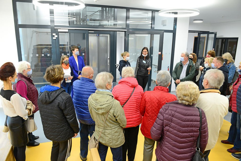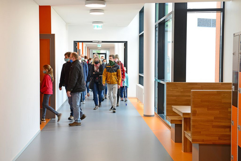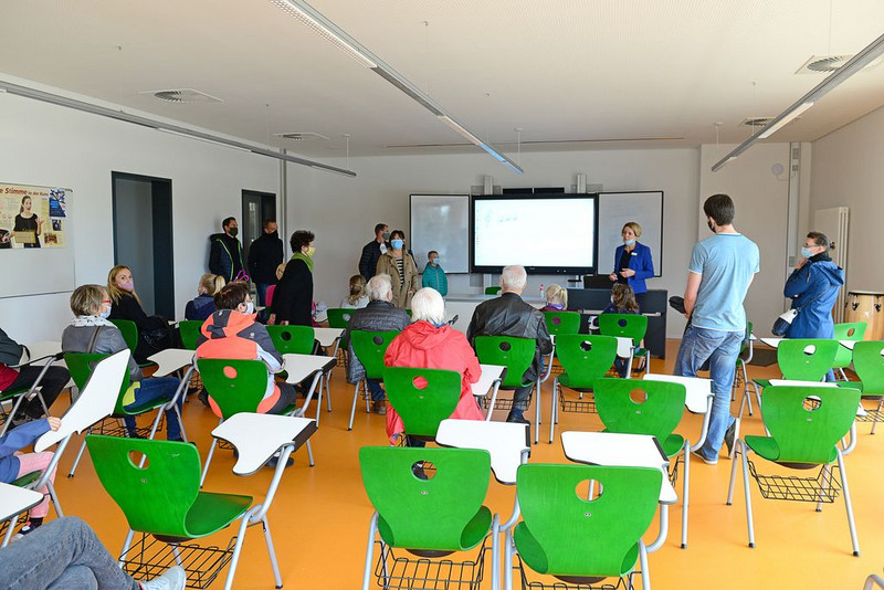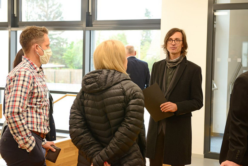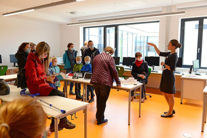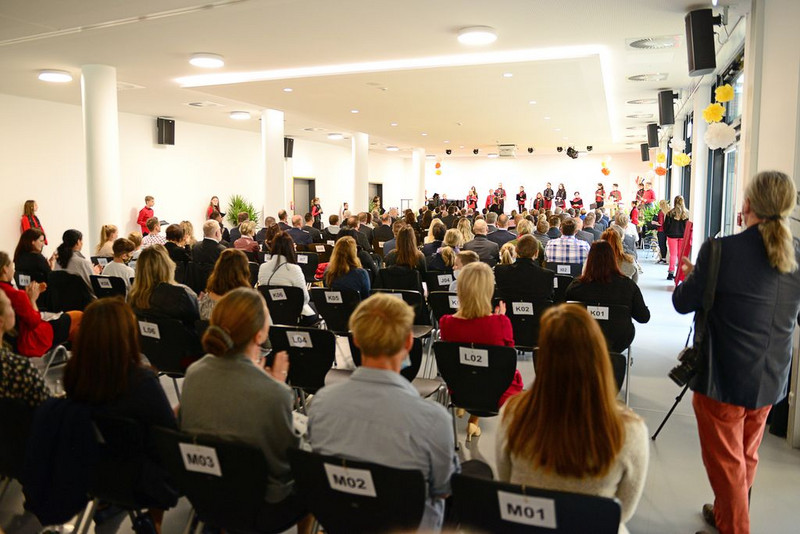 Für die kulturelle Umrahmung der Veranstaltung hatten sich die jungen Gymnasiasten ein anspruchsvolles Programm vorgenommen. Mutig und voller Selbstvertrauen begeisterten die Kinder das Publikum mit ihrem Tanz, Gesang und instrumentalen Fähigkeiten. Sie haben nicht nur künstlerisches Können, sondern mit ihrer ausgestrahlten Freude und Haltung das Besondere des Tages auf sehr persönliche Weise zum Ausdruck gebracht. Im Anschluss an die Festveranstaltung bestand bei einem leckeren Imbiss die Möglichkeit zu zahlreichen Gesprächen sowie die Möglichkeit, das Schulhaus in Begleitung des Architekten zu besichtigen. Beides wurde gern angenommen. Ab 13.00 Uhr wurden für die interessierte Öffentlichkeit vielfältige thematische Führungen angeboten, die unseren Gästen Gelegenheit gaben, hinter die farbenfrohe Fassade des neuen Gymnasiums zu blicken. Insbesondere die freundlichen und hellen Räume, die moderne Ausstattung der Fachkabinette und Klassenzimmer sowie die Gestaltung der Rückzugs- und Pausenbereiche sorgten für Staunen, Anerkennung und Begeisterung. Neben den persönlichen Eindrücken aus dem Inneren des Schulhauses gaben die Führungen vertiefte Einblicke in die inhaltliche Arbeit der Schule. Je nach gewähltem Thema standen der Schulhausbau, das schulische Zusammenleben aus der Sicht von Eltern, Schülern oder der Schulleiterin sowie Schwerpunkte der schulprogrammatischen Arbeit im Fokus der Ausführungen. Das Interesse an diesen Führungen war groß, das anschließende Lob war es auch.