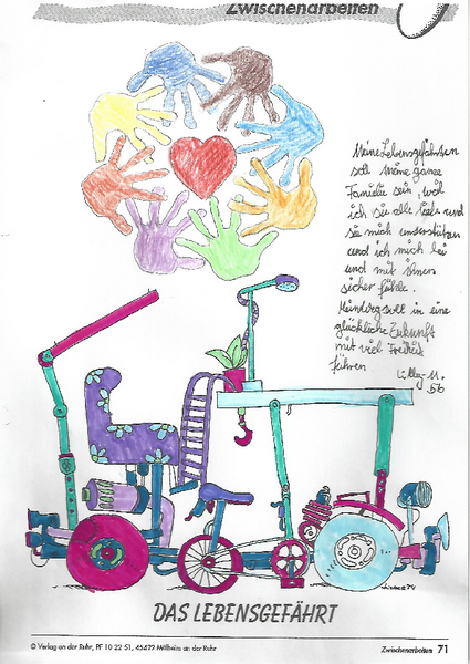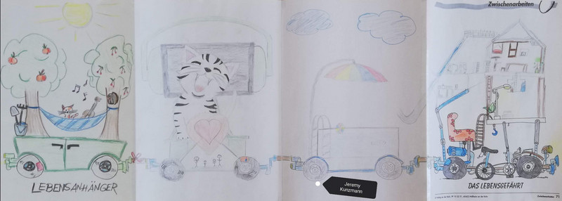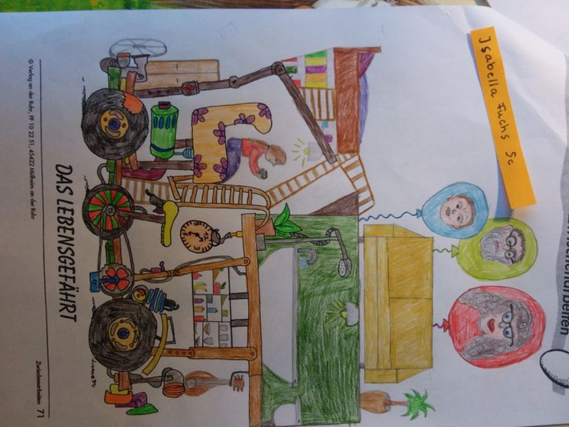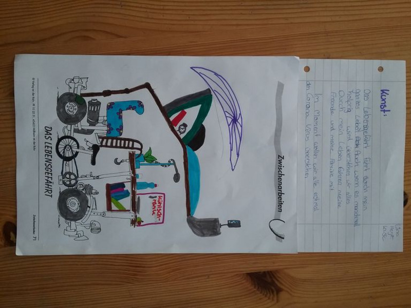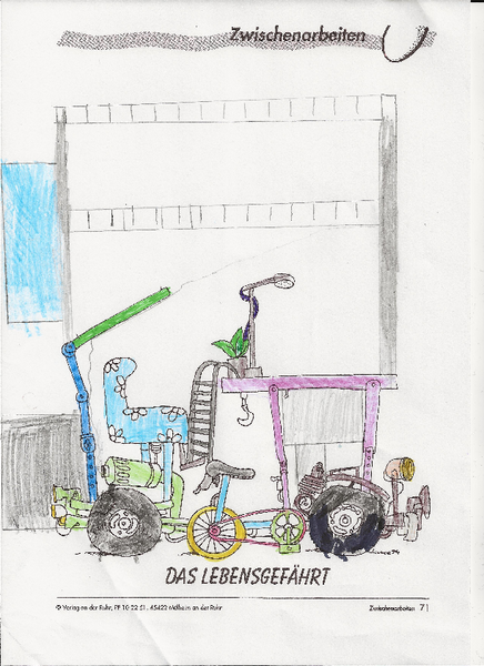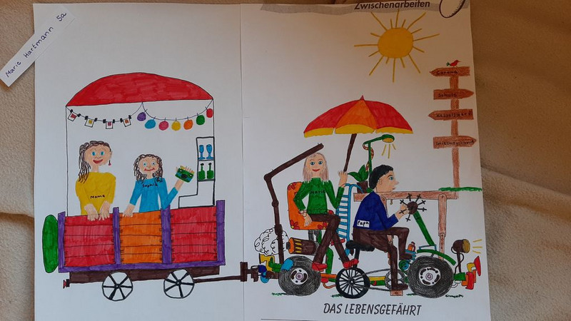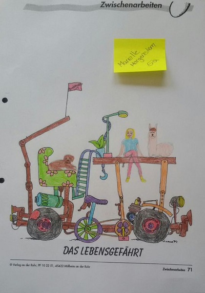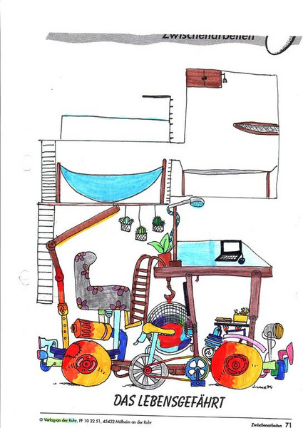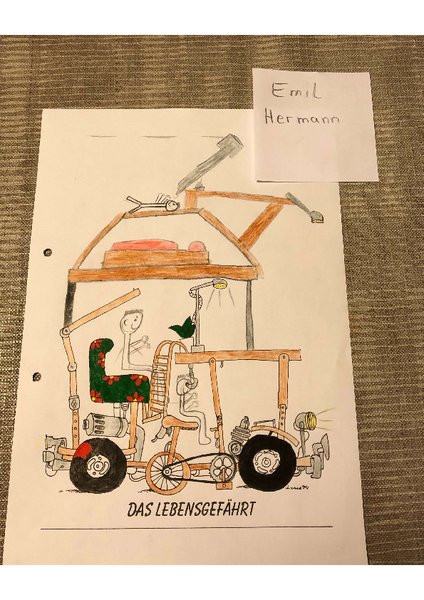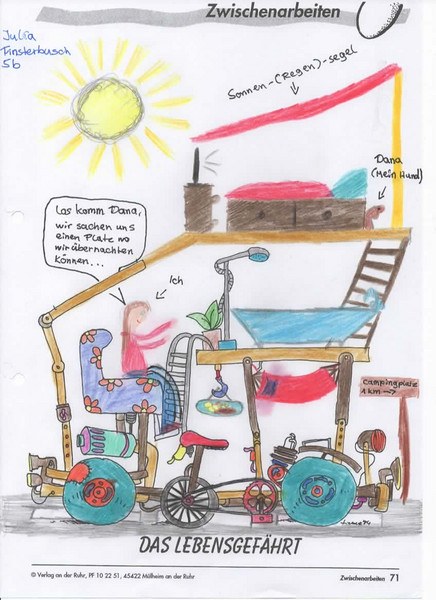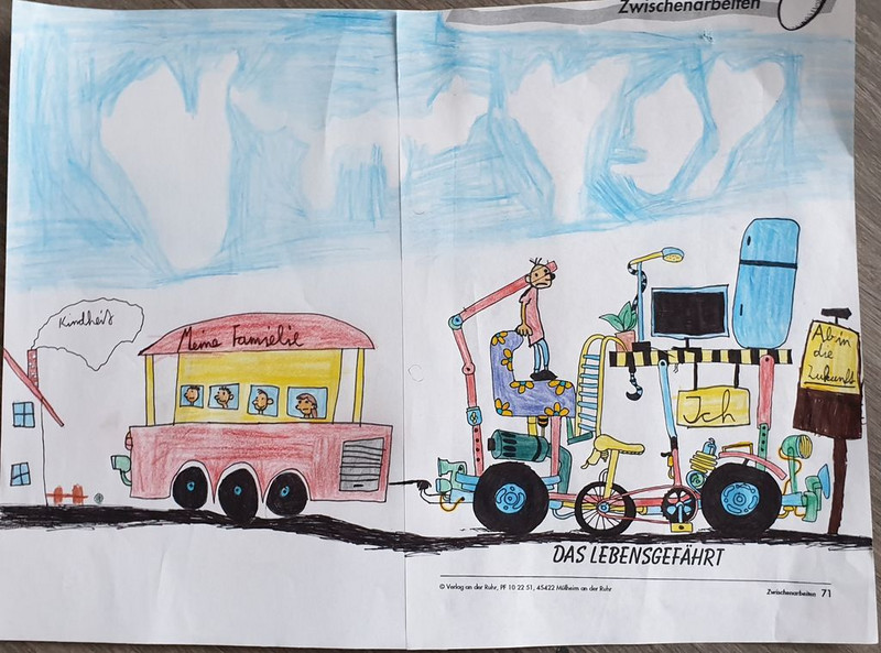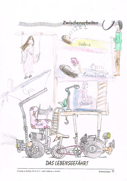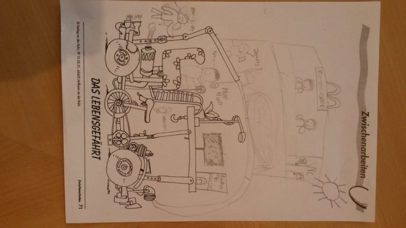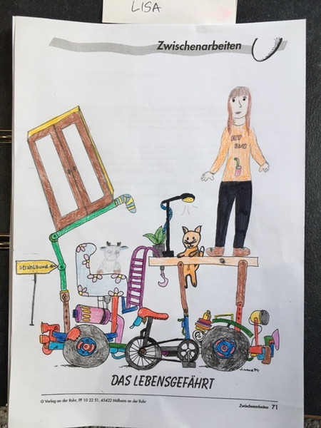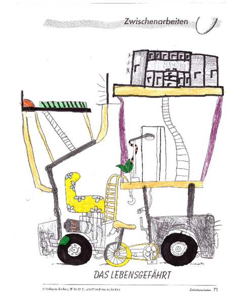 Setzt eine vorgegebene Zeichnung fort mit folgenden Fragen im Hinterkopf. Wir alle "fahren" gerade durch große Veränderungen. Überlege dir, was du dir unter einem "Lebensgefährt" vorstellst.