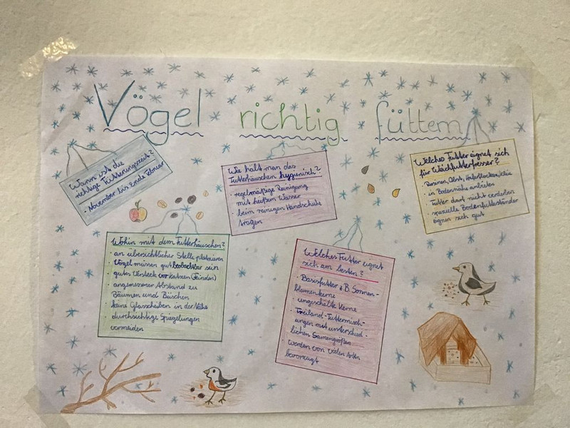 Es entstanden im Rahmen dieses Projektes 18 Vogelfutterhäuser, jede Menge Meisenknödel und kreative Informationstafeln, die die Leser zur gesunden Ganzjahresfütterung unserer Stand- und Strichvögel informieren und aufrufen.