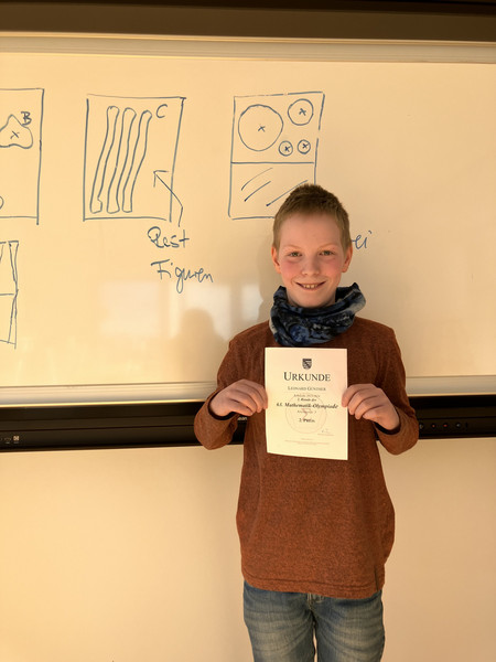 Leonard Günther aus der 5b hat bei der Matheolympiade die zweite Stufe mit 97,5 % erfolgreich abgeschlossen. Leider findet im Jahrgang 5 in diesem Schuljahr keine 3. Stufe statt. Wir sind gespannt, wie er in den kommenden Wettbewerben abschließt. Aktuell steht das Ergebnis des Adam-Ries-Wettbewerb aus.