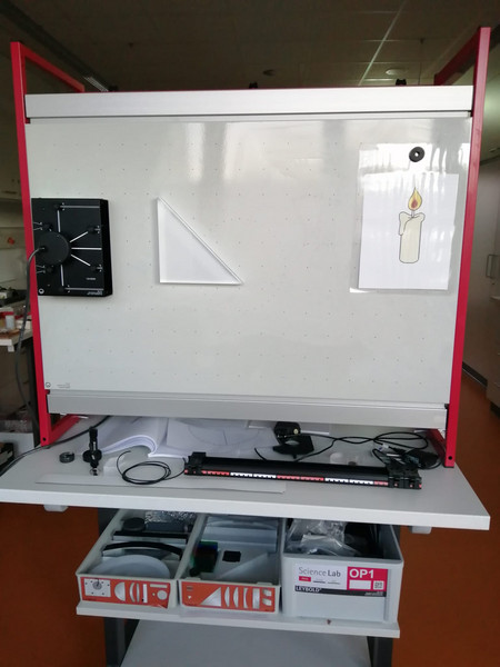 Im Herbst konnte eine Erweiterung des Demonstrations – Experimentierwagens angeschafft werden. Diese betrifft nach der Magnettafel auf der einen Seite (Nutzung für optische Geräte und Lampe) nun die zweite Seite, an der elektrische Schaltungen sowie zwei Messgeräte angebracht werden können. So ist der Wagen optimal nutzbar und braucht beim Wechsel der Klassenstufen im Zimmer nur noch um die eigene Achse gedreht werden und ist wieder einsatzfähig. Auf den Fotos erkennt man diese beiden Seiten.