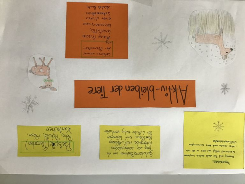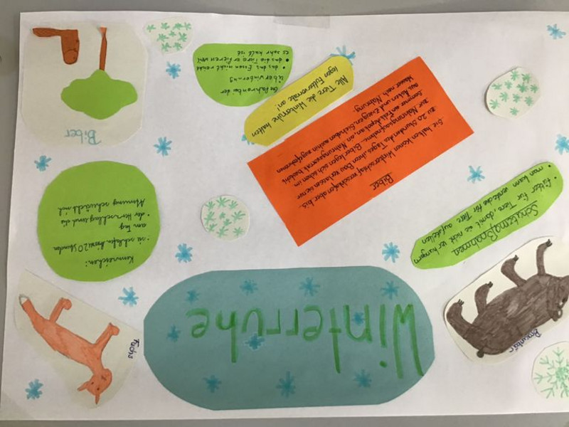 Expertenwissen war gefragt, als die verschiedenen ÜBERWINTERUNGSSTRATEGIEN der Tiere in Wald, Teich und Wiese untersucht wurden. In Forscherrunden wurde recherchiert und diskutiert, dabei konnten alle voneinander lernen. Beim anschließenden Formen von naturnahen Modellen aus Knetmasse wurden überwinternde Tiere "sichtbar". Großbritanniens Wälder, woodlands und forests sowie die darin lebenden Tiere und Pflanzen wurden auf Deutsch und vor allem Englisch erkundet. Die Schüler fertigten zu ausgewählten Lebewesen englische Figurengedichte an. Auf diese Weise entstanden einzigartige Wortkompositionen.