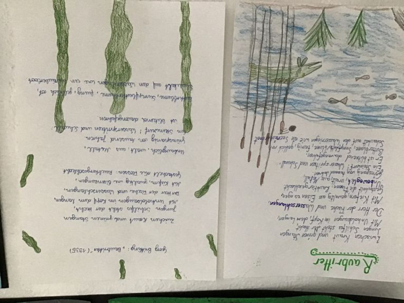 In Klassenstufe 5 beschäftigten sich die Schülerinnen und Schüler mit jahreszeitlichen Aspekten an Wald, Teich und Wiese. Neben musisch-kreativen Zugängen konnten sich alle Beteiligten hautnah bei Exkursion und Teichbesuch von den Vorbereitungen verschiedener Pflanzen und Tiere auf den Winter überzeugen. Es wurde gewerkelt, gezeichnet, gebastelt und vielseitig gelernt. Die neu entstandenen Futterhäuschen helfen schon jetzt unseren heimischen Singvögeln an verschiedenen Stellen der Stadt, die kalte Jahreszeit gut gesättigt zu überdauern.