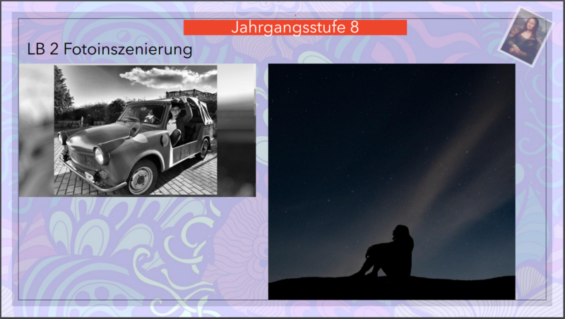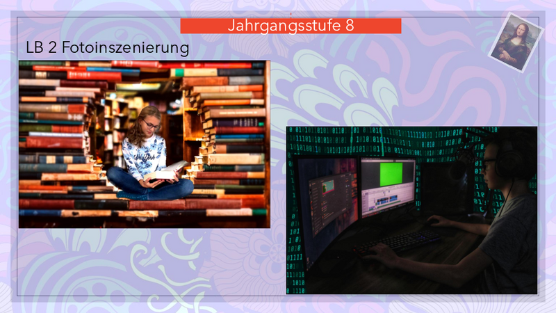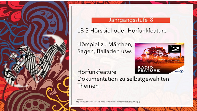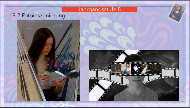 Rein musikalische Projekte entwickelt ihr zunehmend zu kunstübergreifenden Projekten. Ihr erstellt einen persönlich gestalteten Fotofilm im Projekt Fotoinszenierung und ein selbst entwickeltes Hörspiel oder Hörfunkfeature, wobei ihr darin spezifisch kreative Gestaltungsmittel und Arbeitsweisen kennenlernt und unter Einsatz digitaler Medien (Audio- und Videoschnittprogramme) anwendet.