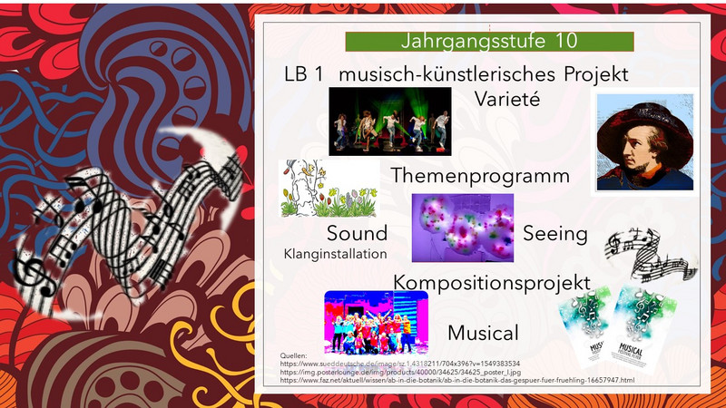 In Klassenstufe 10 erfolgt die Erarbeitung eines besonderen Höhepunktes mit einem eigenständig entwickelten und erarbeiteten musikalisch-künstlerisches Aufführungsprojekt. Hier könnt ihr all euer Erfahrungswissen bei der Gestaltung eigener kreativer musikalischer und künstlerischer Ideen aus den beiden vergangenen Schuljahre einfließen lassen.