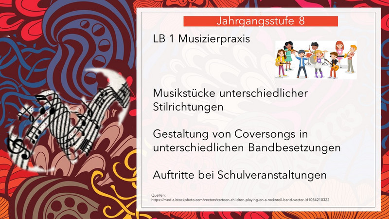 Aktives Musizieren ist geistiges Fitnesstraining: Dazu gehört neben dem Ausbau eurer individuellen Fähigkeiten im Instrumentalspiel und der Entwicklung eurer Singstimme auch das Zusammenspiel in unterschiedlichen Ensembleformen, z. B. beim Projekt Arrangement eines eigenen Coversongs. Ihr lernt miteinander Probenprozesse zunehmend selbstständig zu gestalten und erwerbt Sicherheit in der Bühnenpräsentation. Damit verschafft ihr euch nicht nur Erfolgserlebnisse, sondern entwickelt Kompetenzen, die nicht nur für Schule, sondern auch für Beruf und Persönlichkeit bedeutsam sind: Wahrnehmung, Gestaltung, Ausdruck, Präsentation, Strukturierung sowie vielfältige Kompetenzen des sozialen Miteinanders.